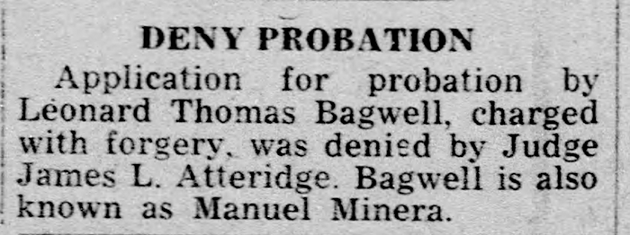 Leonard Thomas Bagwell was born on 7 January 1924 in Gastonia, Gaston County, North Carolina. He was the son of Harold A. Bagwell and Ethel Mae Hovis. He spent time in San Quentin Prison, Marin County, California, for forgery in 17 June 1946. Leonard Thomas Bagwell died on 9 December 1992 in Clayton County, Georgia, at age 68.