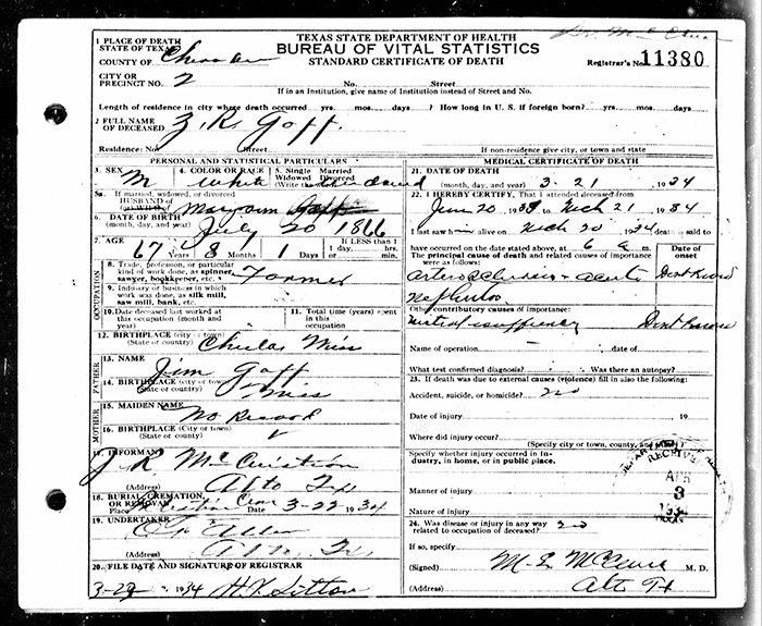 George Henry Goff was born on 12 October 1892 in Alto, Cherokee County, Texas. He was the son of Zachariah R. Goff and Mary Ann Wood. He enlisted in the US Army 23 February 1918 and served during World War I in Company L, 359 Infantry, 90th Division. He was discahrged on June 24, 1919. George Henry Goff died on 29 August 1949 in Rapides Parish, Louisiana, at age 56. He was buried at Old Palestine Cemetery, Alto, Cherokee County, Texas.