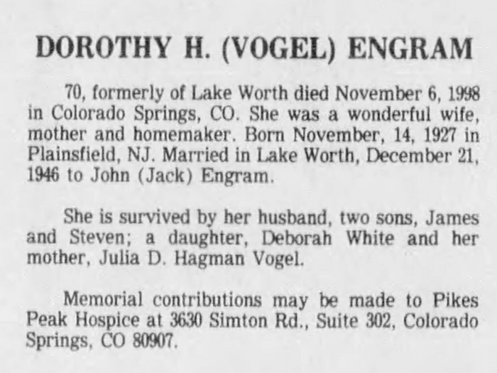 Dorothy Harriett Vogel was born on 14 November 1927 in Plainsfield, New Jersey. As of 21 December 1946,her married name was Engram. She married John Emmett Engram, son of John Claude Engram and Lucille Alberta Curtis, on 21 December 1946 at Palm Beach County, Florida. Dorothy Harriett Vogel died on 6 November 1998 in Colorado Springs, Colorado, at age 70.