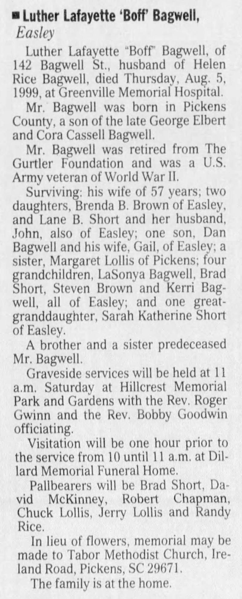 Luther Lafayette Bagwell was also known as Lafayette Bagwell.1 He was born on 16 December 1924 in Easley, Pickens County, South Carolina.1,2 He was the son of George Albert Bagwell and Cora Cassell. Luther Lafayette Bagwell married Sarah Helen Rice. He was a US Navy veteran serving during World War II. Luther Lafayette Bagwell died on 5 August 1999 in Easley, Pickens County, South Carolina, at age 74.2 He was buried on 7 August 1999 at Hillcrest Memorial Park, Pickens County, South Carolina.2