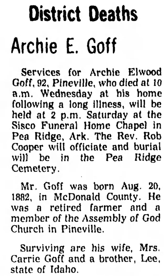 Archie Elwood Goff was born on 20 August 1882 in McDonald County, Missouri. He was the son of William Henry Goff and Minerva Tennessee McCool. Archie Elwood Goff married Mattie Pierce on 20 January 1904 at Pineville, McDonald County, Missouri. Archie Elwood Goff died on 13 November 1974 in Pineville, McDonald County, Missouri, at age 92. He was buried at Pea Ridge Cemetery, Pea Ridge, Benton County, Arkansas.