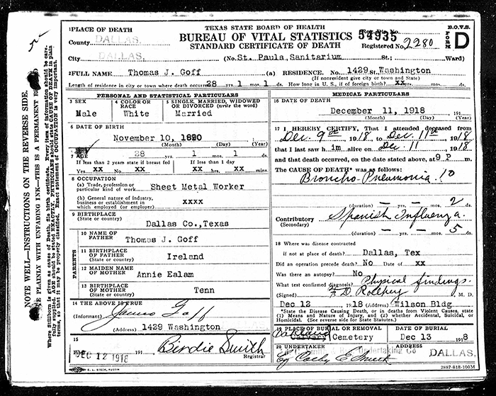 Thomas J. Goff was born on 10 November 1890 in Dallas, Dallas County, Texas. He was the son of Thomas John Goff and Annie Laurie Elam. Thomas J. Goff died on 11 December 1918 in St. Paul Sanitarium, Dallas, Dallas County, Texas, at age 28 of the Spanish Influenza. He was buried on 13 December 1918 at Oakland Cemetery, Dallas, Dallas County, Texas.
