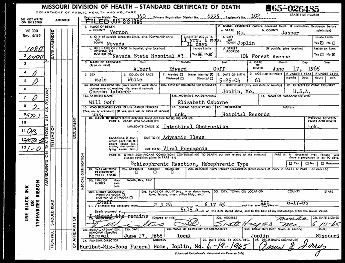 Albert Edward Goff was born on 25 May 1904 in Joplin, Jasper County, Missouri. He was the son of William Goff and Elizabeth Osburn. Albert Edward Goff was buried on 17 June 1965 at Joplin, Jasper County, Missouri. He died on 17 June 1965 in Vernon, Missouri, at age 61.