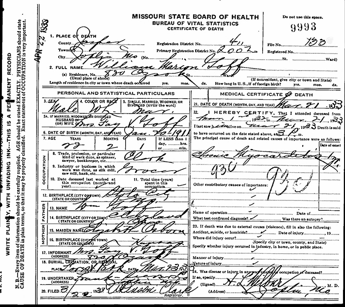 - William Marion Goff b. 20 Jan 1911, d. 21 Mar 1933