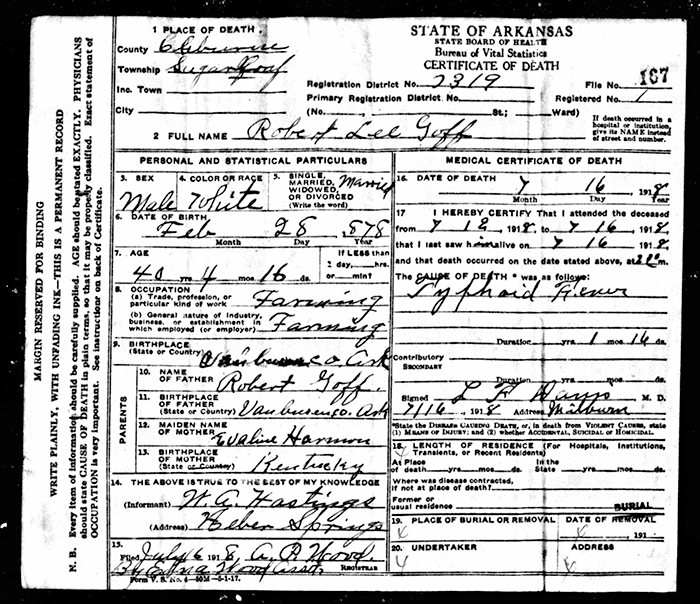 Robert Lee Goff was born on 28 February 1878 in Van Buren County, Arkansas. He was the son of Robert C. Goff and Eveline Harmon. Robert Lee Goff married Maggie Jane Lacy on 20 December 1896 at Cleburne County, Arkansas. Robert Lee Goff was buried on 16 July 1918 at Goff Cemetery, Cleburne County, Arkansas. He died on 16 July 1918 in Sugarloaf, Cleburne County, Arkansas, at age 40.