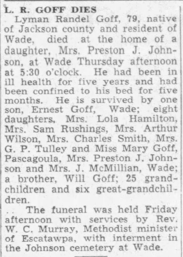 Lyman Randall Goff was born on 24 April 1868. He was the son of William Price Goff and Martha Ann Tanner. Lyman Randall Goff married Cecelia Cumberst on 22 March 1893. Lyman Randall Goff died on 29 April 1943 in Wade, Jackson County, Mississippi, at age 75. He was buried at Johnson Cemetery, Wade, Jackson County, Mississippi.