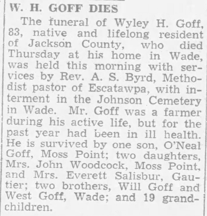 William Wesley Goff was born on 27 March 1862. He was the son of William Price Goff and Martha Ann Tanner. William Wesley Goff died on 5 February 1940 at age 77. He was buried at Johnson Cemetery, Wade, Jackson County, Mississippi.