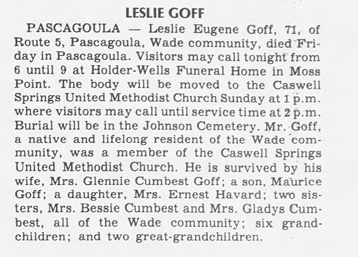 Leslie Eugene Goff was born on 28 June 1908 in Wade, Jackson County, Mississippi. He was the son of Charles Hooker Goff and Ruth Goff. Leslie Eugene Goff married Glennie Rosalie Cumbest on 21 December 1929 at Lucas County, Ohio. Leslie Eugene Goff died on 25 January 1980 in Pascagoula, Jackson County, Mississippi, at age 71. He was buried on 27 January 1980 at Johnson Cemetery, Wade, Jackson County, Mississippi.