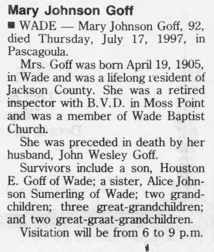 Mary Johnson was born on 19 April 1905 in Wade, Jackson County, Mississippi. As of after 1921,her married name was Goff. She married John Wesley Goff, son of Warren Joseph Goff and Martha Ann Goff, after 1921. Mary Johnson died on 17 July 1997 in Pascagoula, Jackson County, Mississippi, at age 92. She was buried at Johnson Cemetery, Wade, Jackson County, Mississippi.