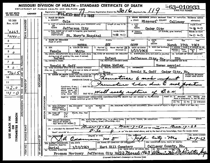 Debra Ann Goff died on 17 March 1963 in Jefferson City, Cole County, Missouri. She was born on 17 March 1963 in Jefferson City, Cole County, Missouri. She was the daughter of Ronald Earl Goff and Joyce Irene Wadley. Debra Ann Goff was buried on 19 March 1963 at Hart Hill Cemetery, Callaway County, Missouri.
