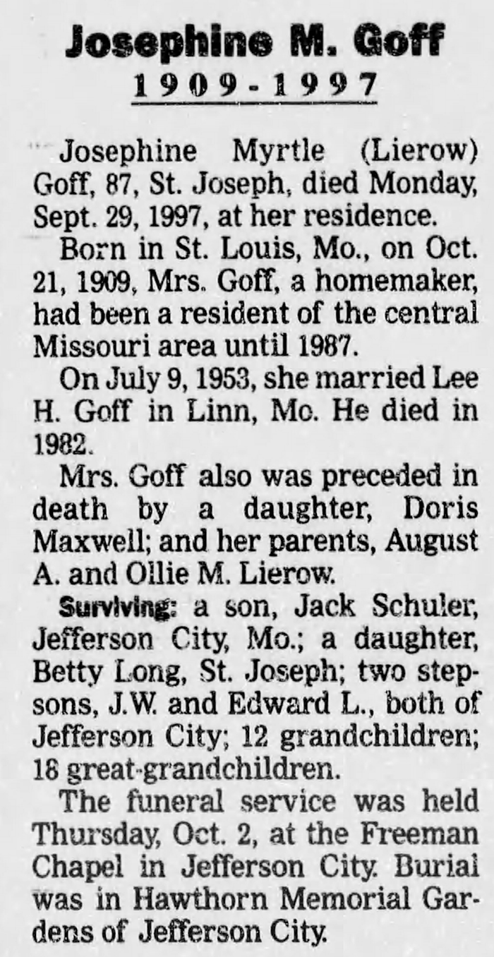 Josephine Myrtle Lierow was born on 21 October 1909 in St. Louis City, St. Louis County, Missouri. As of 9 July 1953,her married name was Goff. She married Lee Harrison Goff, son of Samuel Goff and Hattie Elizabeth Hodges, on 9 July 1953 at Linn, Osage County, Missouri. Josephine Myrtle Lierow died on 29 September 1997 in Missouri at age 87. She was buried on 2 October 1997 at Hawthorn Memorial Gardens, Jefferson City, Cole County, Missouri.