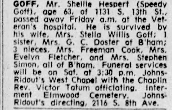 Shellie Hespert Goff was born on 9 February 1898 in Alabama. He was the son of William W. Goff and Callie Knight. He served in Company H., 2nd Infantry, National Guards (Florida) from 2 July 1916 to 27 March 1917. Shellie Hespert Goff married Stella Mary Willis on 20 November 1920 at Birmingham, Jefferson County, Alabama. Shellie Hespert Goff died on 26 May 1961 in Birmingham, Jefferson County, Alabama, at age 63. He was buried at Elmwood Cemetery, Birmingham, Jefferson County, Alabama.