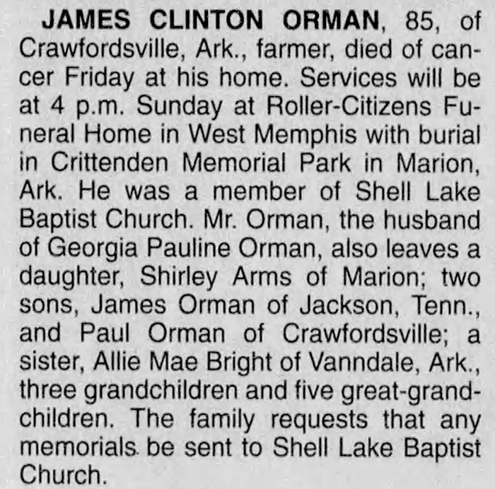 James Clinton Orman was born in 1914. He married Georgia Pauline Bagwell, daughter of Robert Fulton Bagwell and Wardie Jane Robertson, before 24 April 1940 at Mississippi.1 James Clinton Orman and Georgia Pauline Bagwell lived in 1946 in Crittenden County, Arkansas.1 James Clinton Orman died in 1999. He was buried at Crittenden Memorial Park, Marion, Crittenden County, Arkansas.