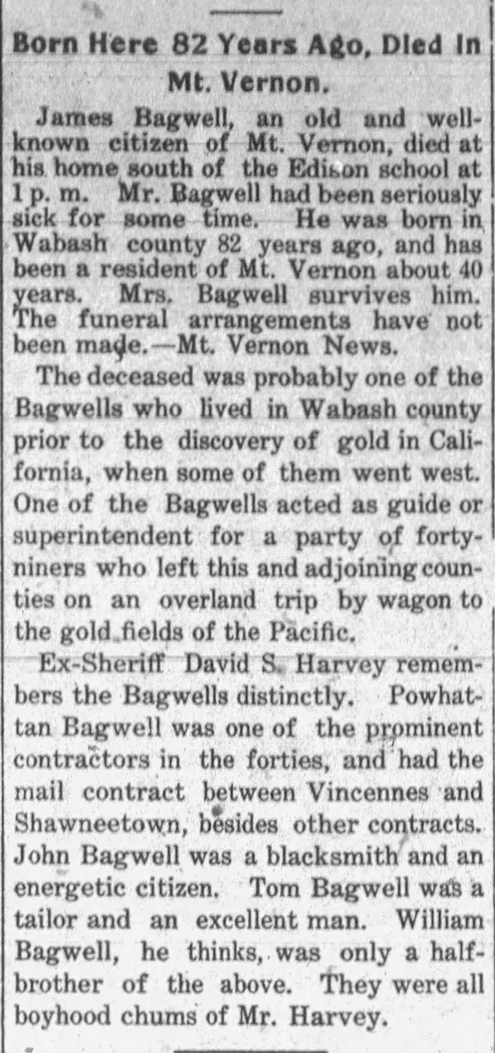 Sarah Miller was born in the State of Tennessee, on the 26th day of October, 1835. She came with her parents to Jefferson County, Illinois, when a child. They settled about 3 miles northeast of Mt. Vernon. Here she grew to womanhood, and at the age of 22 she was united in marriage with James Bagwell. She is the last surviving member of a family of 8 children, and has been a resident of Jefferson County over 70 years. Her husband died about ten years ago, since then she has made her home with her nieces. Her last illness was of 5 weeks duration. She was tenderly cared for at the home of Mr. And Mrs. Wm. Hogue, where she passed away on March 29, 1915 at 12:25 A.M., aged 79 years 5 months and 3 days. Mrs. Bagwell was converted and joined the Baptist Church at East Salem, when a girl, being a member of that church for years. At the time of her death she was a member of the First Baptist Church in Mt. Vernon. She was a good religious woman and died very happy singing as long as she had voice the old hymns “Jesus Lover of My Soul” and “Happy Day”, singing the last named a short time before she passed away. She leaves the following nieces and nephews to mourn their loss; Mrs. Wm. Hogue, Mrs. Laura Shelton, Mrs. Ed Wallis, Mrs. Ora Browder, John W. Perry, Joe and Henry Barefield, Edgar, Elvin and Harmon Miller. After a short funeral service conducted by Rev. J. C. Kinison, at the home where she died March 29th, at 1:30 P.M., her remains were taken to Hopewell Cemetery for burial.