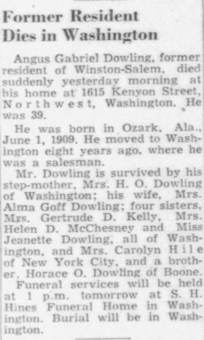 - Angus Gabriel Dowling b. 1 Jun 1909, d. 28 Feb 1949