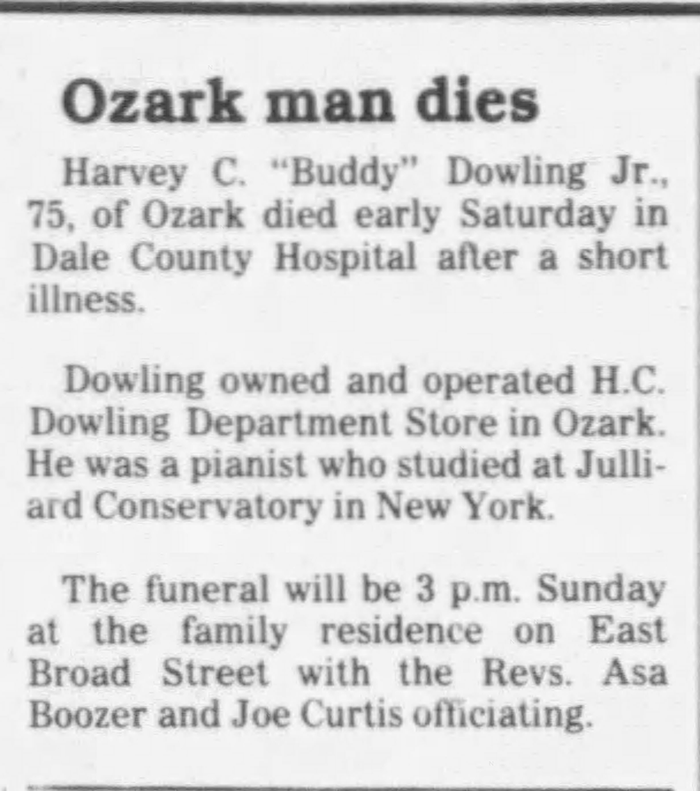 Horace O'Neal Dowling Jr. was born on 21 January 1906 in Ozark, Dale County, Alabama. He was the son of Horace O'Neal Dowling and Nora Brown Bowen. Horace O'Neal Dowling Jr. married Lucy Pearl Payne on 29 November 1933 at Danville, Virginia. Horace O'Neal Dowling Jr. died on 16 December 1997 in Montgomery, Hamilton County, Ohio, at age 91. He was buried at Mountlawn Memorial Park and Gardens, Boone, Watauga County, North Carolina.