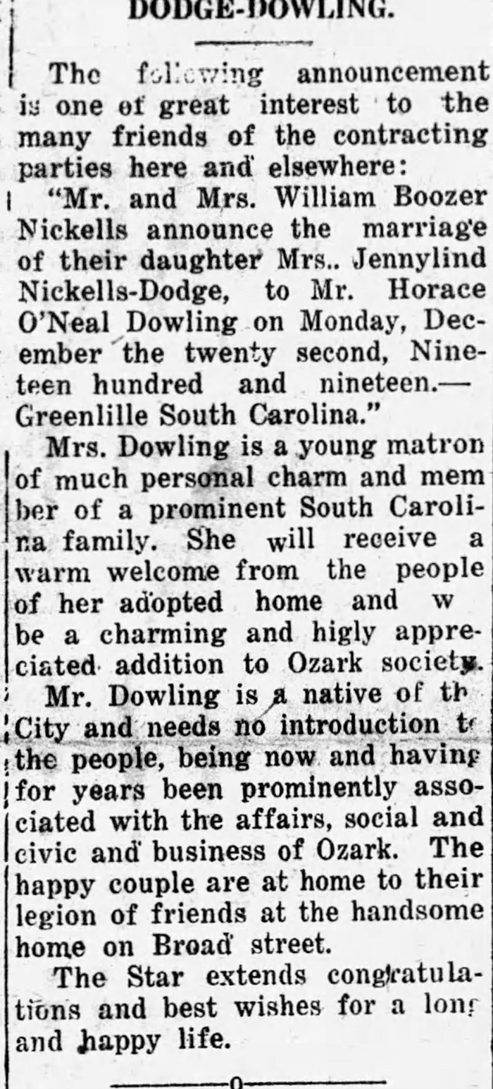 Jennylind Nickels married Horace O'Neal Dowling, son of Judge Gabriel Pastory Dowling and Zilphia Ann Smith, on 22 December 1919 at Greenlille, Soutn Carolina.