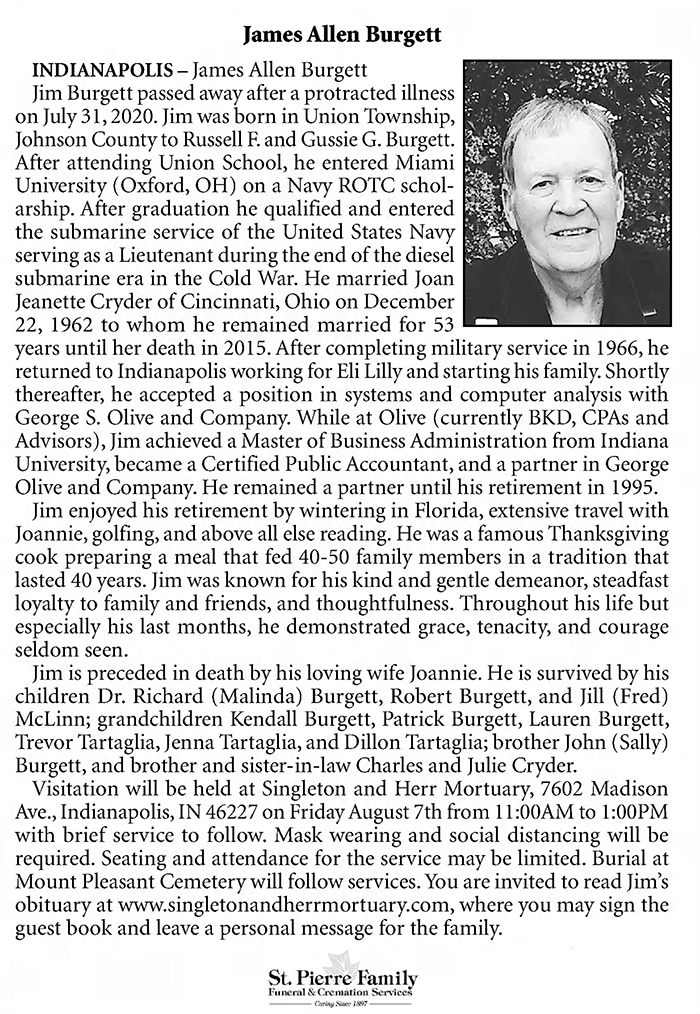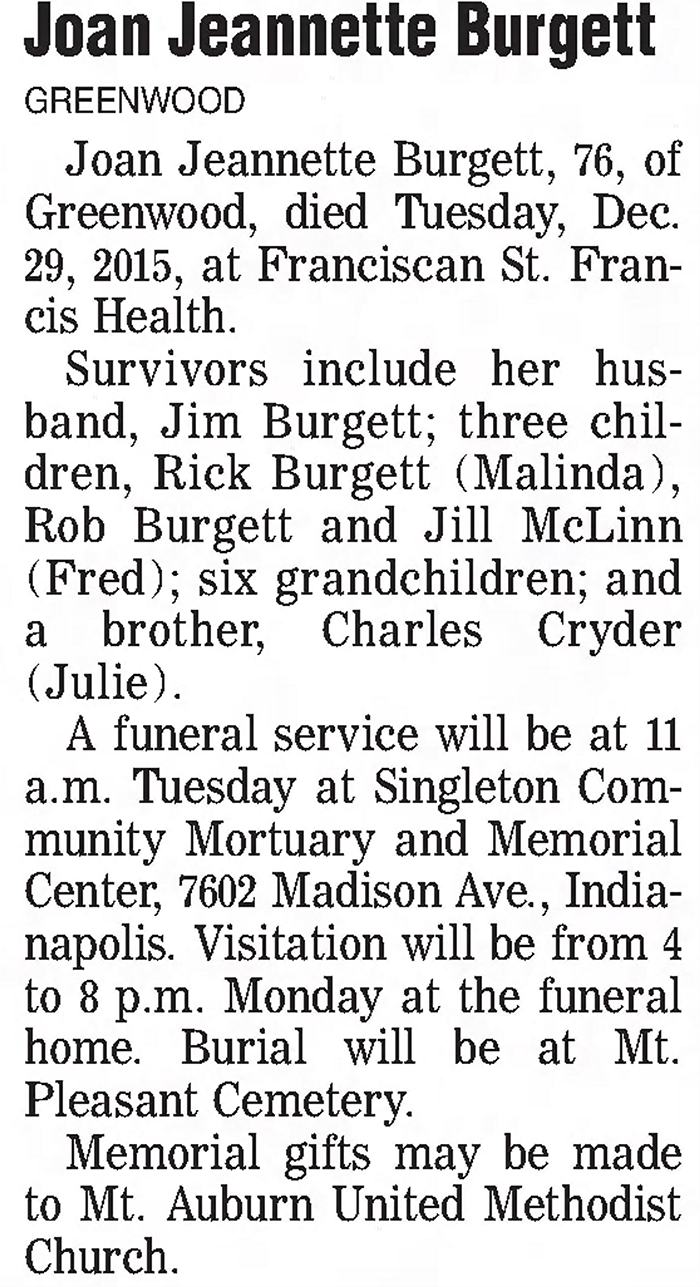 Joan Jeannette Cryder was born on 4 February 1939 in Cinncinnati, Hamilton County, Ohio. She married Lieutenant James Allen Burgett, son of Russell F. Burgett and Gussie Glynn Smith, on 22 December 1962 at Wyoming Ohio Presbyterian Church, Wyoming, Ohio. As of 22 December 1962,her married name was Burgett. Joan Jeannette Cryder died on 29 December 2015 in Indianapolis, Marion County, Indiana, at age 76. She was buried on 5 January 2016 at Mount Pleasant Cemetery, Greenwood, Johnson County, Indiana.