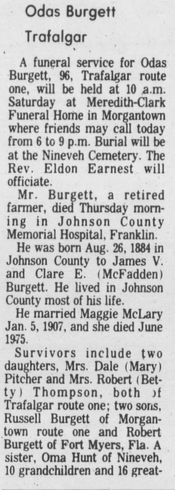 Odas Burgett was born on 26 August 1884 in Trafalger, Johnson County, Indiana. He was the son of James Valentine Burgett and Clarissa Elizabeth McFadden. Odas Burgett married Maggie McLary before 1910. Odas Burgett died on 23 April 1981 in Johnson County Memorial Hospital, Franklin, Johnson County, Indiana, at age 96. He was buried on 24 April 1981 at Nineveh Christian Church Cemetery, Nineveh, Johnson County, Indiana.