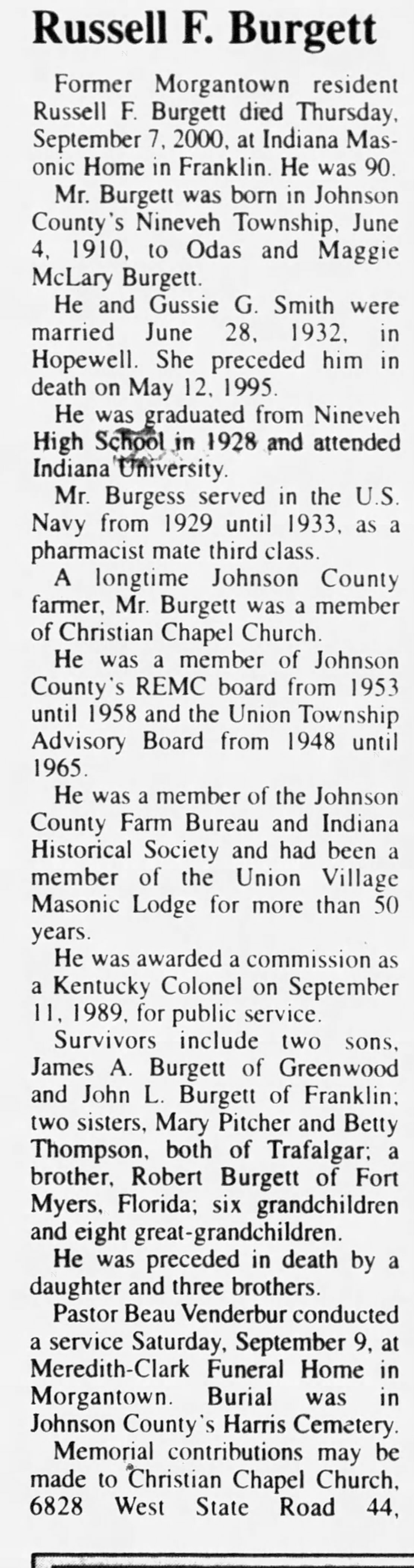 Russell F. Burgett was born on 4 June 1910 in Ninevah, Johnson County, indiana. He was the son of Odas Burgett and Maggie McLary. Russell F. Burgett married Gussie Glynn Smith on 28 June 1932 at Hopewell, Indiana. Russell F. Burgett died on 7 September 2000 in Franklin, Johnson County, indiana, at age 90. He was buried at Harris Cemetery, Union Township, Johnson County, indiana.