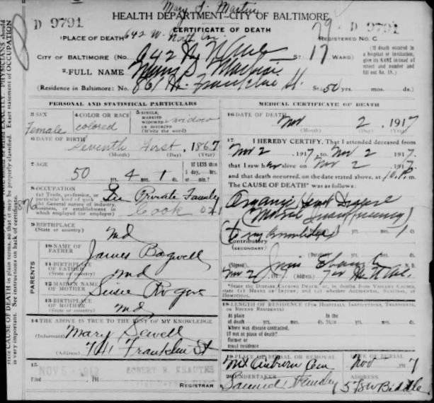Mary S. Bagwell was born on 1 July 1867. She was the daughter of James Bagwell and Susie Rogers. Mary S. Bagwell died on 2 November 1917 in Baltimore, Baltimore City, Maryland, at age 50. She was buried at Mount Auburn Cemetery, Baltimore, Baltimore City, Maryland.