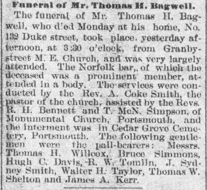 Thomas H. Bagwell was born circa 1857 in Virginia. He was the son of Dr. Thomas H. Bagwell and Imogene Culpepper. Thomas H. Bagwell died on 17 September 1895 in Norfolk, Virginia. He was buried on 18 September 1895 at Cedar Grove Cemetery, Portsmouth, Portsmouth City, Virginia.