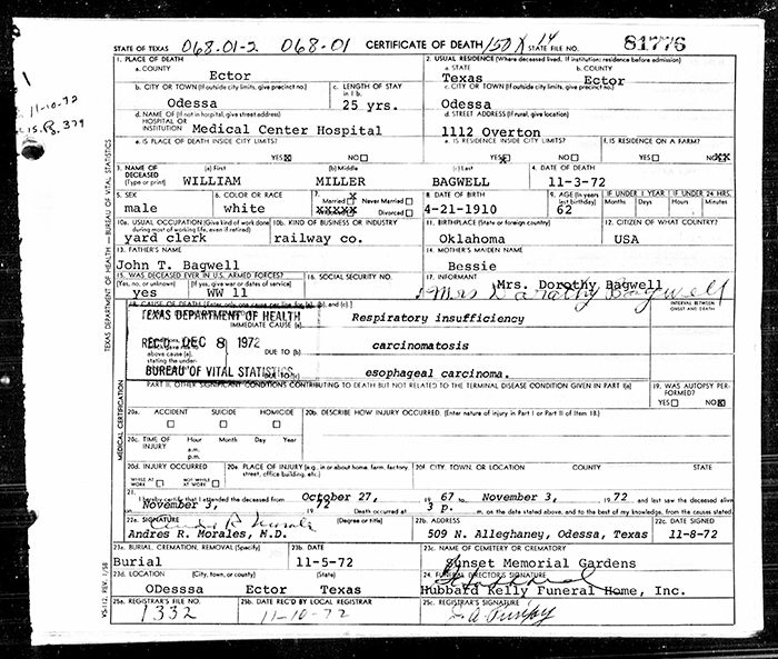 William Miller Bagwell was born on 21 April 1910 in Oklahoma. He was the son of John Tilley Bagwell Jr. and Elizabeth S. Harvey. He enlisted in the US AMary on 7 May 1942 at Fort Bliss (El Paso, TX) and served as a TEC 4 during World War II. He also worked for the Railroad and reeceived a pension from the. William Miller Bagwell married Dorothy Ulela “Lela” Knight on 25 August 1972 at Gaines County, Texas. William Miller Bagwell died on 3 November 1972 in Odessa Medical Center Hospital, Odessa, Ector County, Texas, at age 62. He was buried on 5 November 1972 at Sunset Memorial Gardens, Odessa, Ector County, Texas.