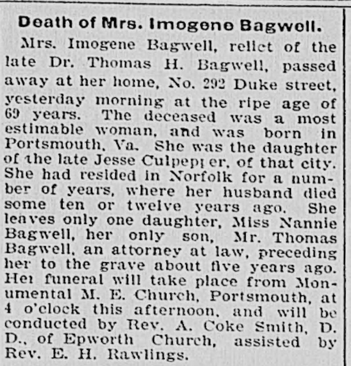 Imogene Culpepper was born circa 1831 in Portsmouth, Portsmouth City, Virginia. As of before 1854,her married name was Bagwell. She married Dr. Thomas H. Bagwell, son of Healy Drummond Bagwell and Elizabeth Parker Bloxom, before 1854. Imogene Culpepper died on 5 March 1900 in Norfolk, Virginia.