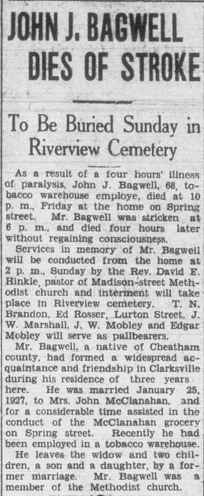 Sarah Jane Travelsted was born on 4 March 1856 in East Cape Girardeau, Alexander County, Illinois. As of before 1889,her married name was McClanahan. She married John A. McClanahan before 1889. As of before 1929,her married name was Bagwell. Sarah Jane Travelsted married John Jefferson Bagwell before 1929. Sarah Jane Travelsted died on 29 November 1944 in Clarksville, Montgomery County, Tennessee, at age 88. She was buried on 30 November 1944 at Riverview Cemetery, Clarksville, Montgomery County, Tennessee.