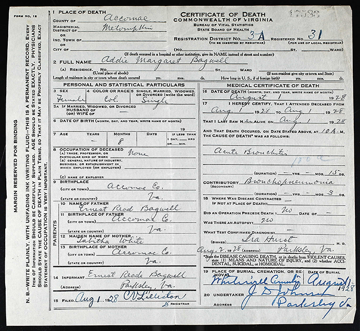 Addie Margaret Bagwell was born circa January 1928 in Accomac County, Virginia. She was the daughter of Ernest Reed Bagwell and Tabitha White. Addie Margaret Bagwell was buried on 1 August 1928 at Whitesville, Virginia. She died on 1 August 1928 in Accomac County, Virginia.