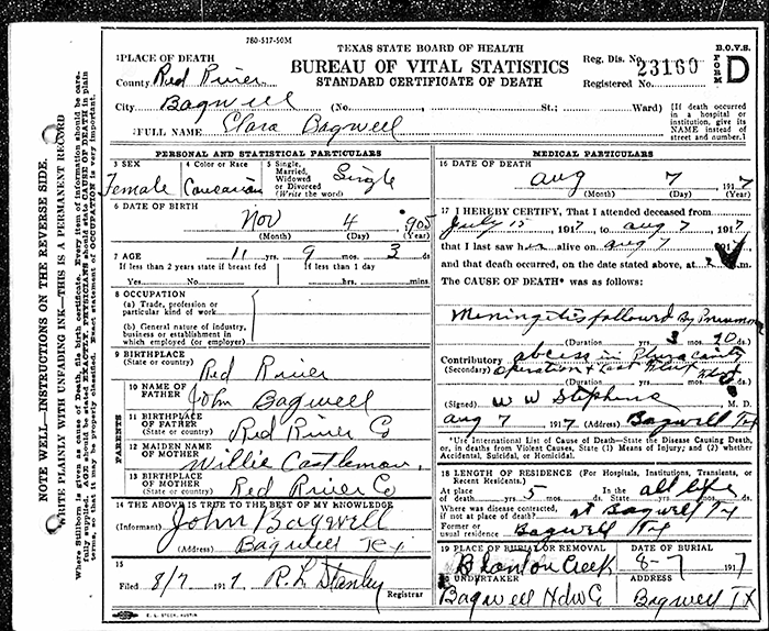 Clara Bagwell was born on 4 November 1905 in Red River County, Texas. She was the daughter of John Abner Bagwell and Willie Mae Castleman. Clara Bagwell died on 7 August 1917 in Bagwell, Red River County, Texas, at age 11 of meningitis followed by pnemonia. She was buried on 8 August 1917 at Blanton Creek Cemetery, Bagwell, Red River County, Texas.