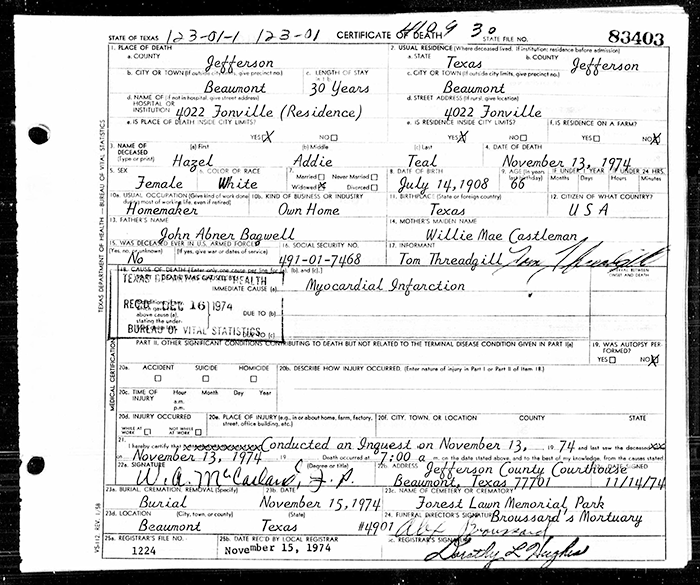 Hazel Addie Bagwell was born on 14 July 1908 in Texas. She was the daughter of John Abner Bagwell and Willie Mae Castleman. As of 26 September 1925,her married name was Threadgill. Hazel Addie Bagwell married Samuel George Threadgill on 26 September 1925 at Grayson County, Texas. Hazel Addie Bagwell and Samuel George Threadgill were divorced on 29 December 1942 at Sebastian County, Arkansas. As of 18 February 1950,her married name was Teal. Hazel Addie Bagwell married Irvin Jay Teal on 18 February 1950 at Jefferson County, Texas. Hazel Addie Bagwell died on 13 November 1974 in Beaumont, Jefferson County, Texas, at age 66. She was buried on 15 November 1974 at Forest Lawn Memorial Park and Funeral Home, Beaumont, Jefferson County, Texas.