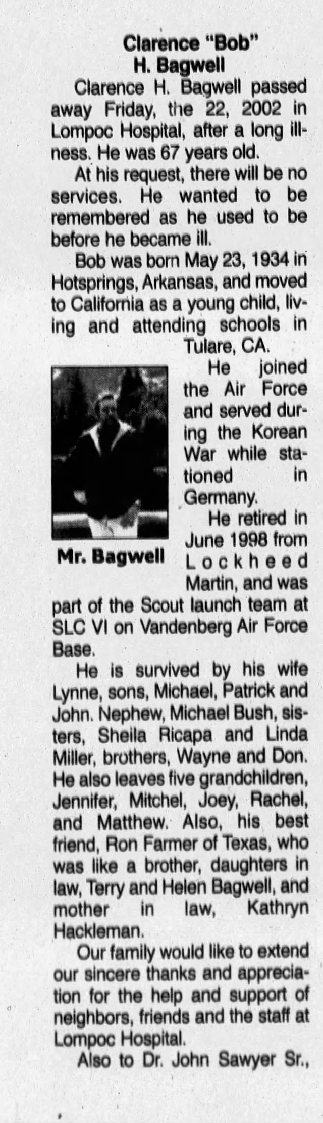 Clarence Hoyet Bagwell was born on 23 May 1934 in Hot Springs, Arkansas. He was the son of James Milton Bagwell and Clara Bell Duncan. Clarence Hoyet Bagwell married Janice Fielder on 10 July 1957 at Clark County, Nevada. Clarence Hoyet Bagwell married Lynne N. Roth on 30 September 1965 at Clark County, Nevada. Clarence Hoyet Bagwell died on 22 March 2002 in Lompoc Hospital, Lompoc, California, at age 67.