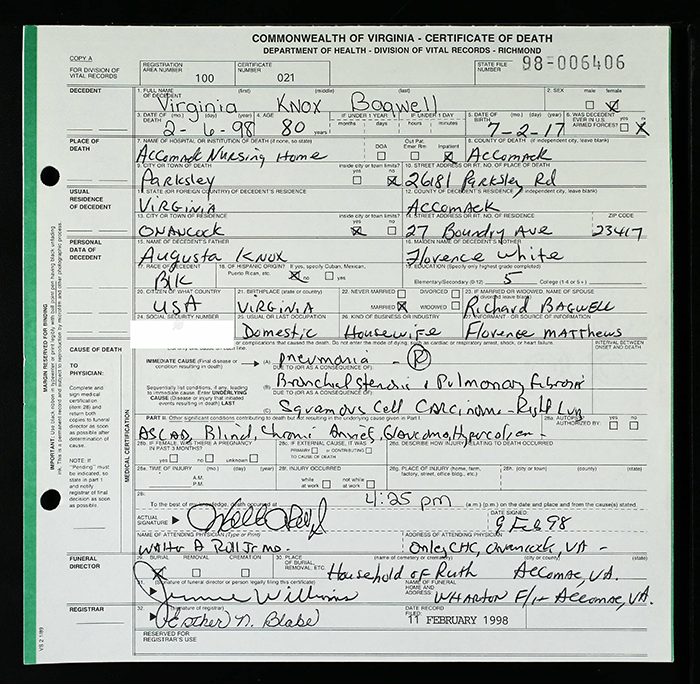 Virginia Marion Knox was born on 2 July 1917 in Virginia. As of before 1932,her married name was Bagwell. She married Richard Bagwell Sr., son of John E. Allen and Martha Bagwell, before 1932. Virginia Marion Knox died on 6 February 1998 in Accomack Nursing Home, Parksley, Accomack County, Virginia, at age 80. She was buried at Household of Ruth Cemetery, Accomac, Accomack County, Virginia.
