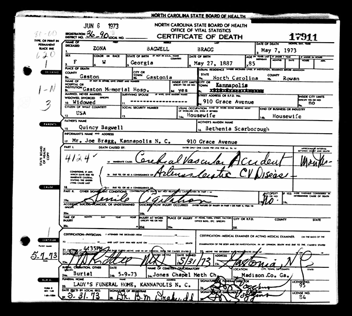 Arizona Bagwell was born on 27 May 1887 in Georgia. She was the daughter of John Quincy Bagwell and Bethenia Scarborough. As of after 1900,her married name was Bragg. Arizona Bagwell married Joe Boyd Bragg after 1900. Arizona Bagwell died on 7 May 1973 in Gastonia, Gaston County, North Carolina, at age 85. She was buried on 9 May 1973 at Jones Chapel Methodist Church Cemetery, Danielsville, Madison County, Georgia.