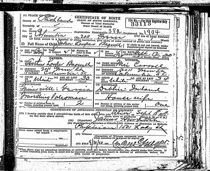 Mai Juliette Carroll married Arthur Lauper Bagwell, son of John Minor Bagwell and Olla Josephine 'Josie' Barrett, circa 1919 at Richland County, South Carolina.