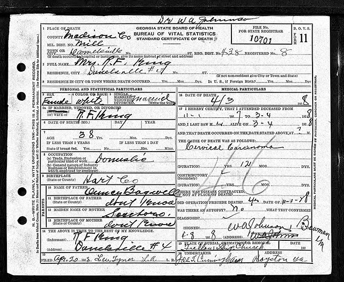 Female Bagwell was born circa 1890 in Hart County, Georgia. She was the daughter of John Quincy Bagwell and Bethenia Scarborough. As of after 1905,her married name was King. Female Bagwell married R.F. King after 1905. Female Bagwell died on 3 April 1928 in Madison County, Georgia.