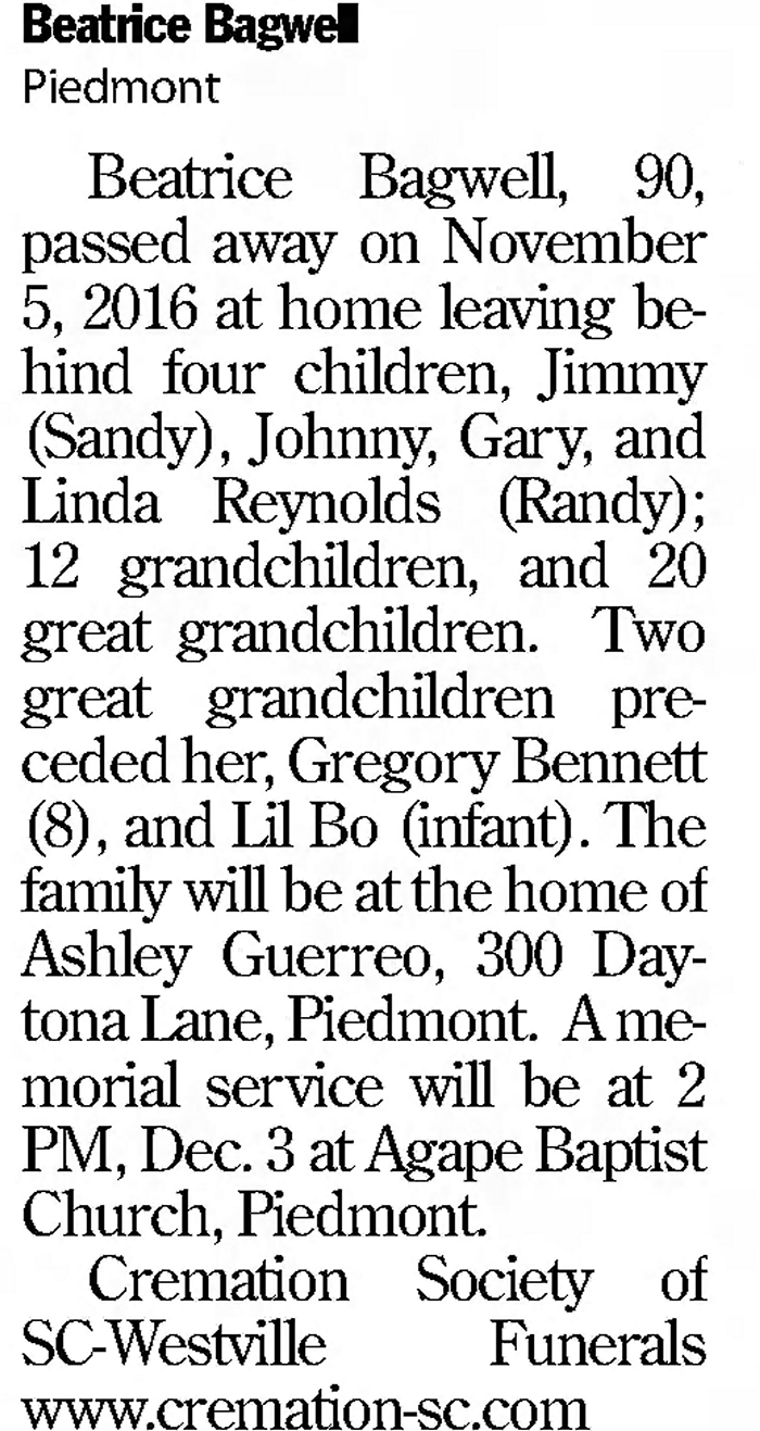 Beatrice Effie Pittman was born circa 1926 in Georgia. She married James Willis Bagwell, son of Clifton Murphy Anderson Bagwell and Jessie Mae Hicks, before 1950. As of before 1950,her married name was Bagwell. Beatrice Effie Pittman died on 5 November 2016 in South Carolina.