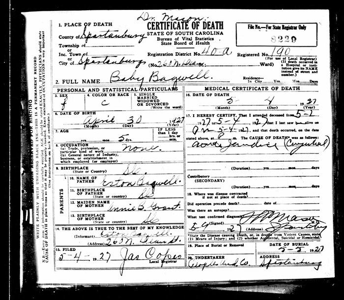 Baby Bagwell was born on 30 April 1927 in Spartanburg, Spartanburg County, South Carolina. She was the daughter of George Eston Bagwell and Annie Belle Grant. Baby Bagwell died on 4 May 1927 in Spartanburg, Spartanburg County, South Carolina. She was buried on 5 May 1927 at Spartanburg, Spartanburg County, South Carolina.