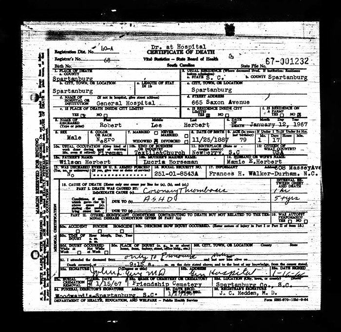 Robert Lee Herbert was born on 25 November 1887 in Spartanburg, Spartanburg County, South Carolina. He married Georgia Bagwell, daughter of George W. Bagwell and Louise Rookard, after 1900. Robert Lee Herbert died on 12 January 1967 in Spartanburg, Spartanburg County, South Carolina, at age 79. He was buried on 17 January 1967 at Friendship Baptist Church Cemetery, Spartanburg, Spartanburg County, South Carolina.