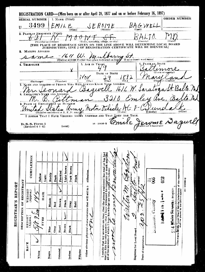 Emile Jerome Bagwell was born on 29 November 1894 in Baltimore, Maryland. He was the son of George W. Bagwell and Susan Ellen Hatten. He served as a Corporal in the US Army during World War I. Emile Jerome Bagwell died on 14 June 1970 at age 75. He was buried on 19 June 1970 at Baltimore National Cemetery, Baltimore, City of Baltimore, Maryland.