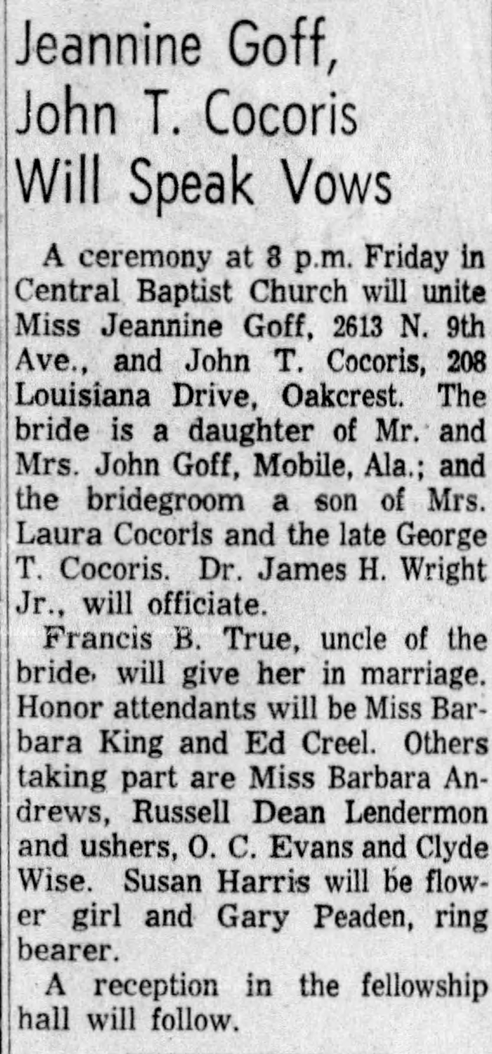 John T. Cocoris married Jeannine Lane Goff, daughter of John William Goff and Winnie Davis Turner, in June 1962 at Escambia County, Florida. John T. Cocoris and Jeannine Lane Goff were divorced on 19 April 1988 at Escambia County, Florida.