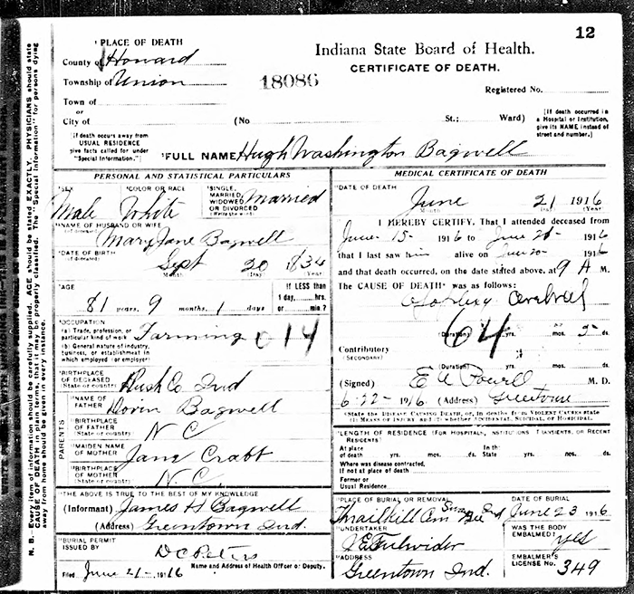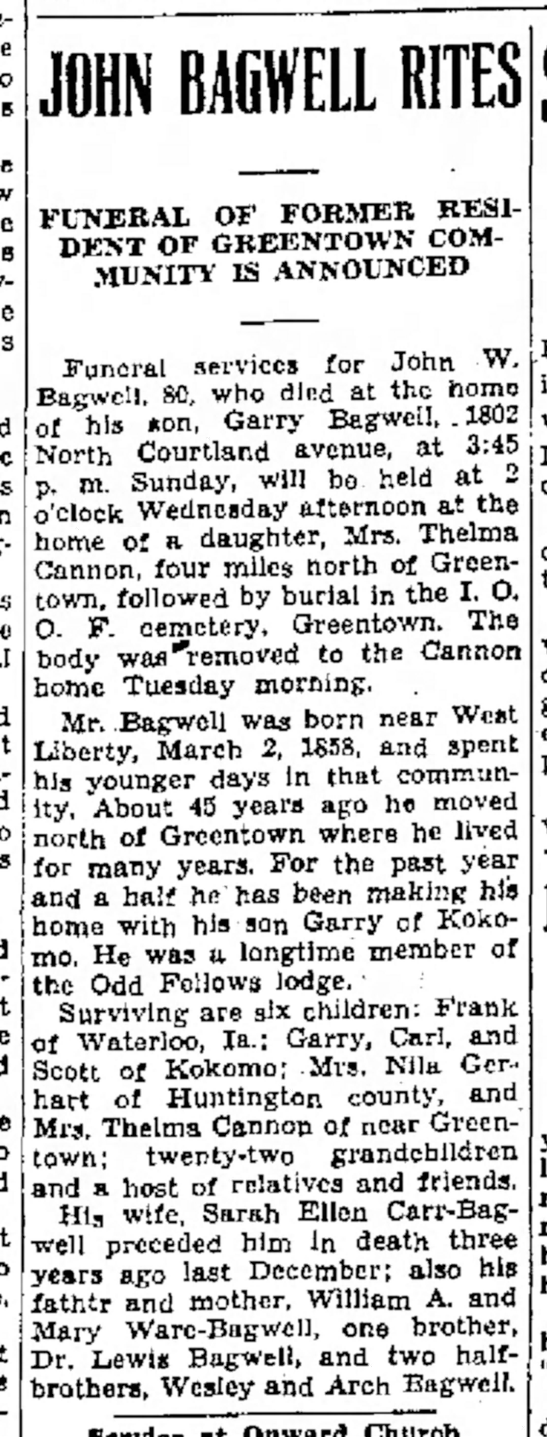 - [S855] Jacob Bagwell (Kokomo Tribune), January 4 1975, http://edanddebby.com/HCC/Greenlawn/Bagwell_Jacob.JPG