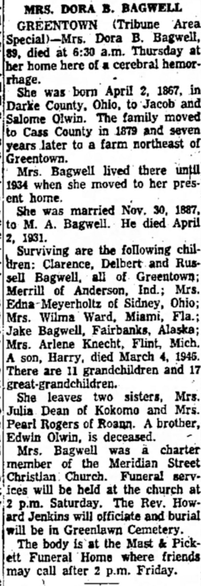 - [S862] Dora B. Bagwell (Kokomo Tribune), After 15 Nov 1956, http://edanddebby.com/HCC/Greenlawn/Bagwell_Dora.jpg