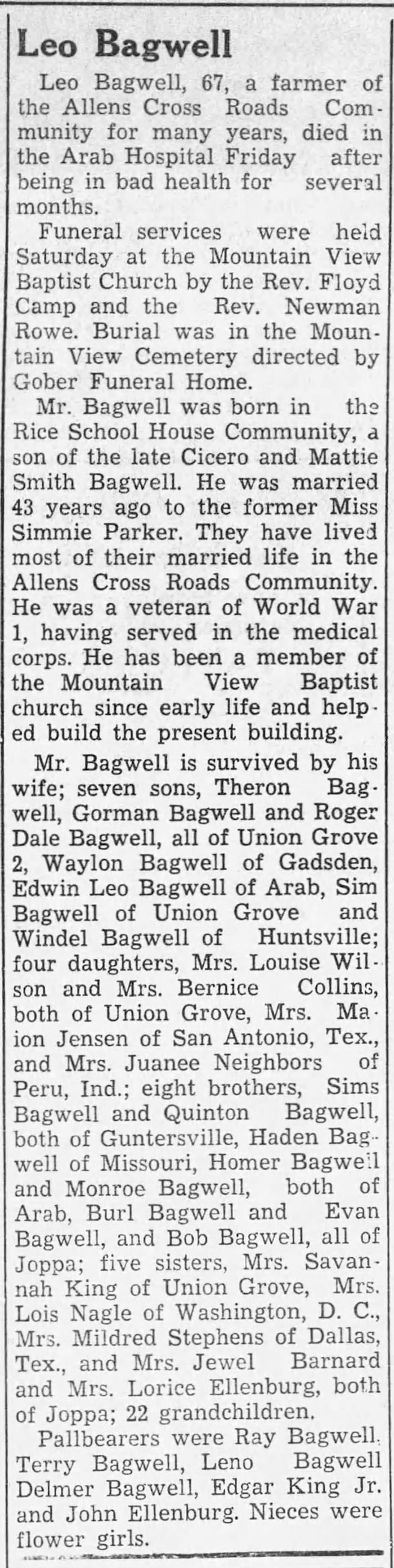 - [S5108] Leo Bagwell Grave Stone, Find a Grave, www.findagrave.com, http://www.findagrave.com/cgi-bin/fg.cgi