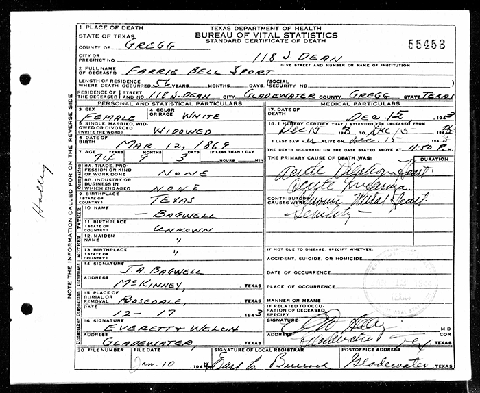 Farrie Belle Bagwell was born on 12 March 1869 in Robbinsville, Red River County, Texas. She was the daughter of Nathaniel Robbins Bagwell and Sarah Elizabeth Rogers. As of 13 October 1887,her married name was Bozeman. Farrie Belle Bagwell married J. A. Bozeman on 13 October 1887 at Red River County, Texas. As of 19 November 1891,her married name was Sport. Farrie Belle Bagwell married James Emmett Sport on 19 November 1891 at Red River County, Texas. Farrie Belle Bagwell died on 15 December 1943 in Gregg County, Texas, at age 74. She was buried on 17 December 1943 at Rosedale Cemetery, Gladewater, Gregg County, Texas. She was buried at Old Shamrock Cemetery, Bagwell, Red River County, Texas.