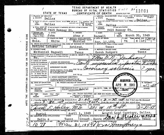 John Abner Bagwell was born on 19 September 1873 in Texas.1 He was the son of Nathaniel Robbins Bagwell and Sarah Elizabeth Rogers. John Abner Bagwell married Willie Mae Castleman on 14 October 1901 at Red River County, Texas.2 John Abner Bagwell died on 30 March 1949 in Clarksville City, Red River County, Texas, at age 75.1 He was buried on 1 April 1949 at Laurel Land Memorial Park, Dallas, Dallas County, Texas.1
