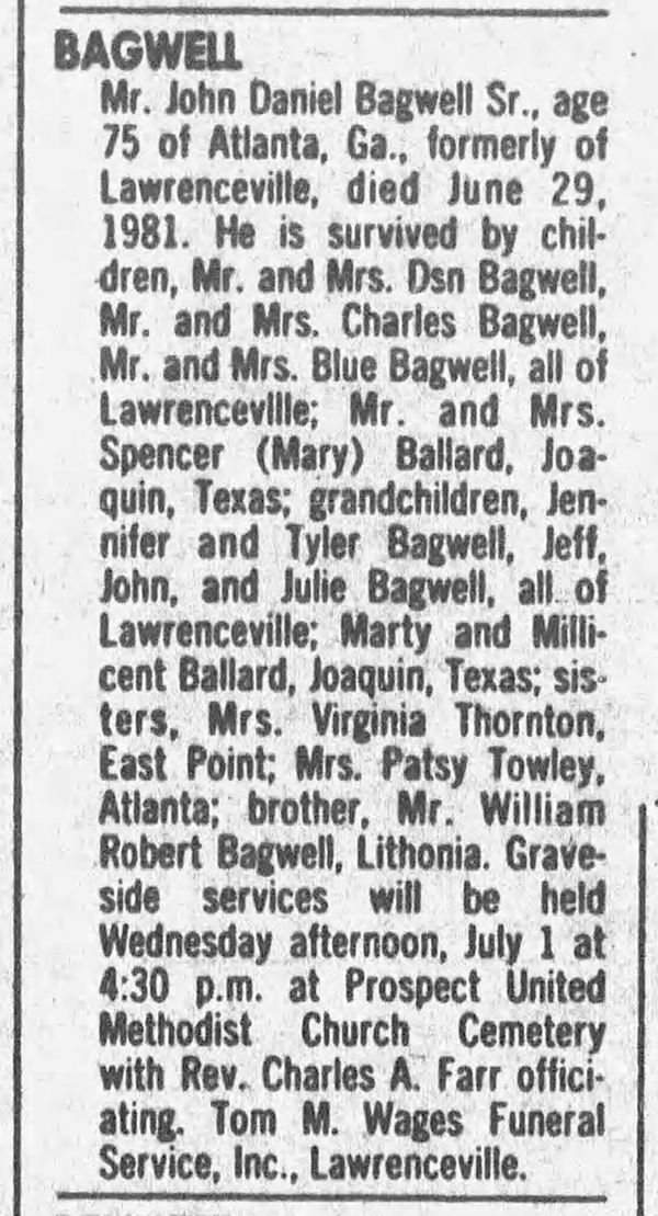 John Daniel Bagwell Jr. died on 29 June 1981 in Fulton County, Georgia, at age 75.1 He was buried at Prospect United Methodist Church Cemetery, Lawrenceville, Gwinnett County, Georgia.1