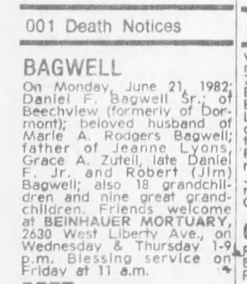 - Daniel Fowle Bagwell Jr.+ b. 25 Mar 1927, d. 29 Jun 1981