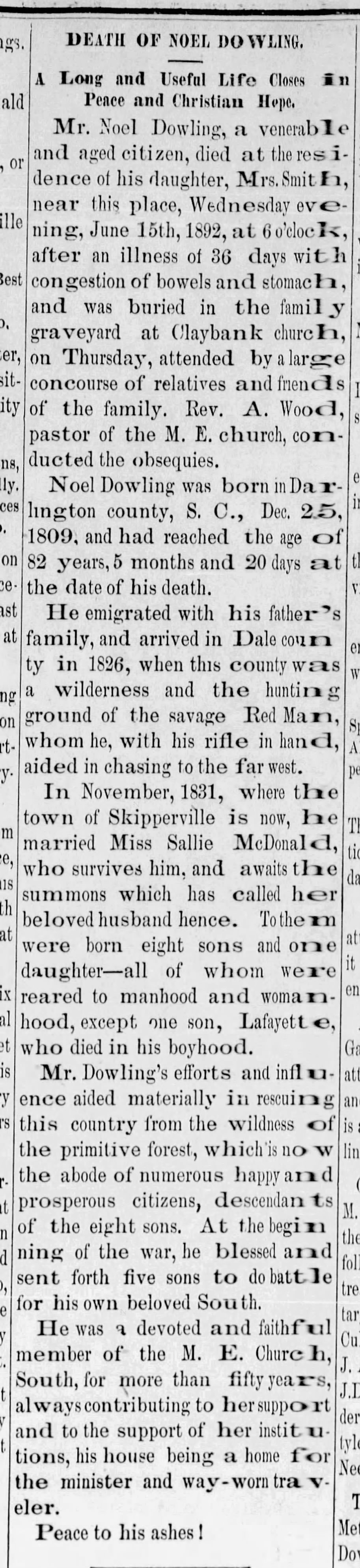 Noel Dowling was born on 25 December 1809 in Darlington District, South Carolina, (Hence the name Noel.)1,2 He was the son of Dempsey Dowling and Martha Stokes.1,2,3 Noel Dowling married Sarah Delayney McDonald, daughter of Reverend John McDonald and Sarah Unknown, on 17 November 1831 at Dale County, Alabama.4,2,3 Noel Dowling died on 15 June 1892 in Ozark, Dale County, Alabama, at age 82. He was buried on 23 June 1892 at Claybank Cemetery, Ozark, Dale County, Alabama.1